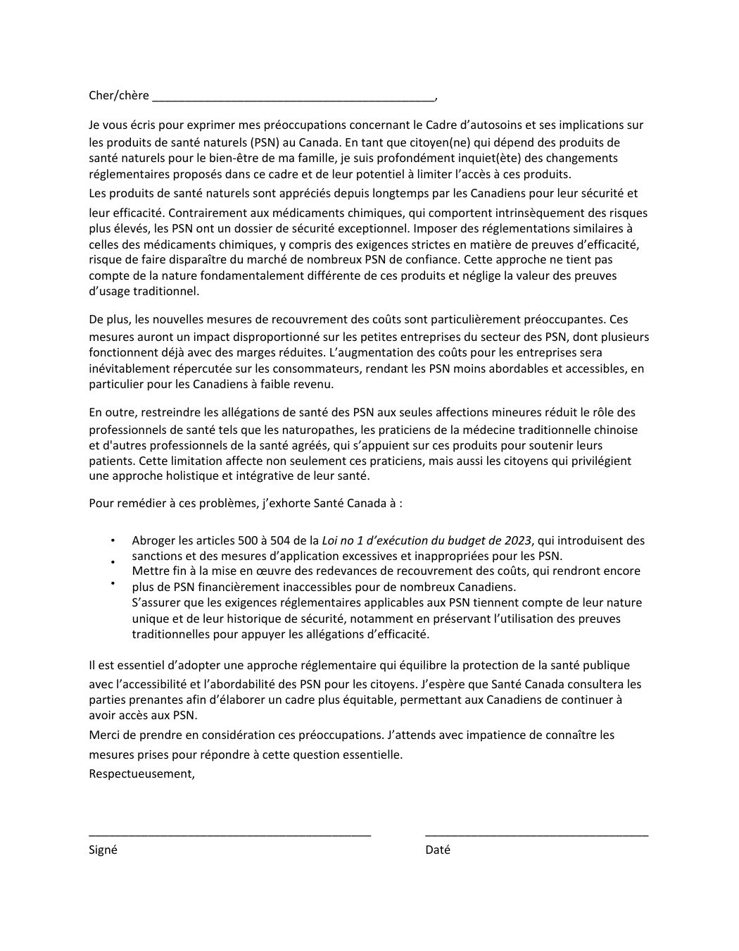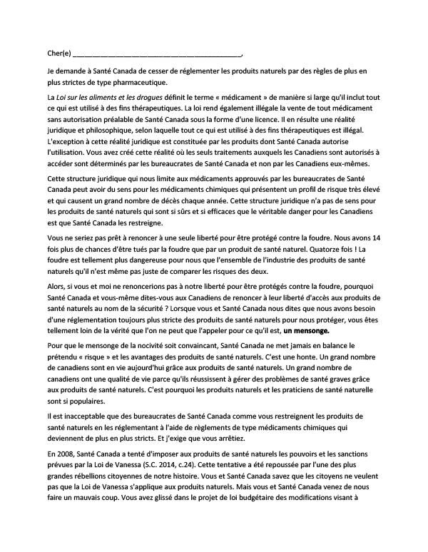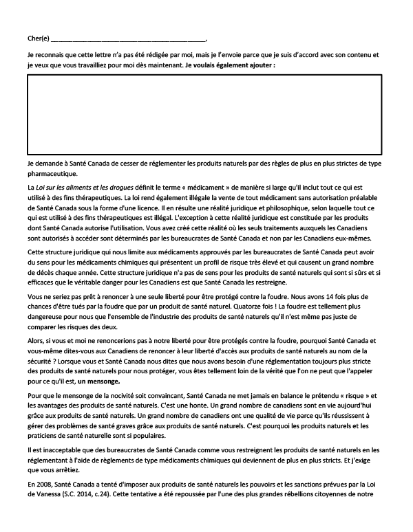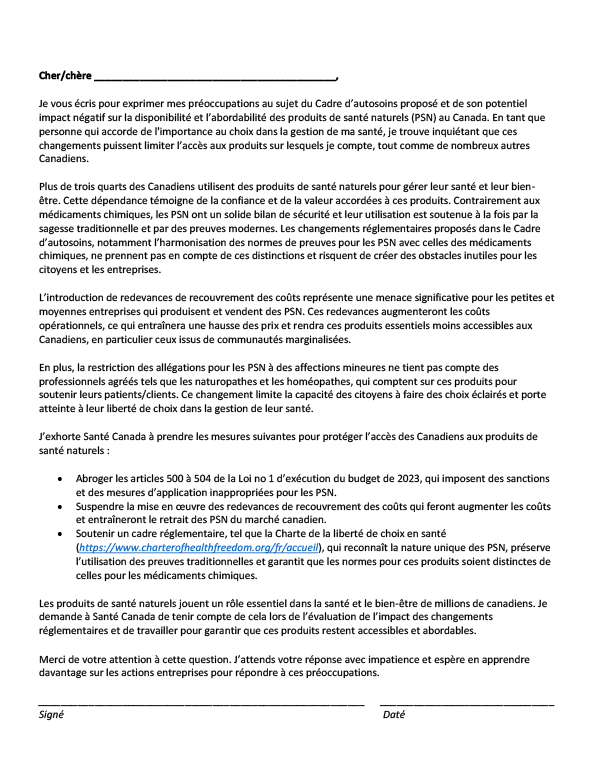 Il est temps de défendre les produits de santé naturels. Faites le premier pas en envoyant une lettre électronique dès aujourd’hui et faites savoir à Santé Canada que la réglementation excessive des PSN est inacceptable.