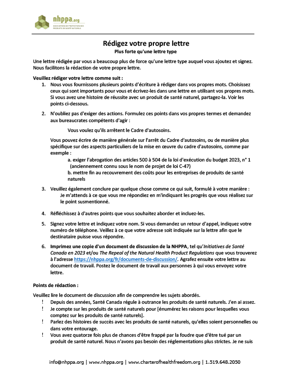 Votre droit de choisir des produits de santé naturels est menacé, mais vous pouvez faire la différence. En contactant directement les bureaucrates responsables de ces politiques, vous pouvez exiger la fin des réglementations restrictives qui nuisent aux consommateurs et aux petites entreprises. Que ce soit par téléphone, courriel ou lettre, votre voix peut aider à garantir que les PSN restent accessibles et abordables pour tous les Canadiens.