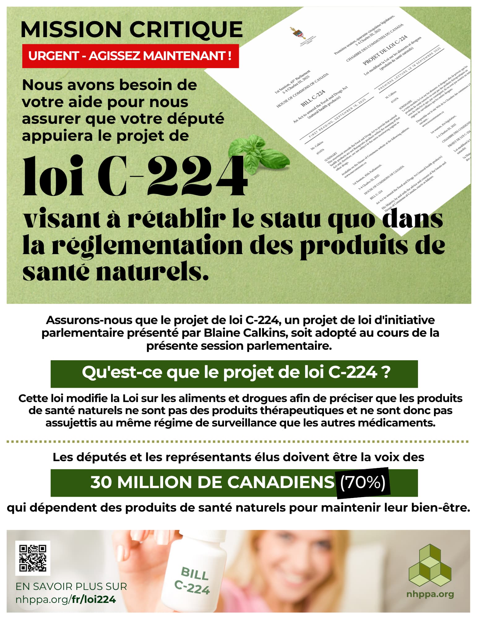 Nos remèdes naturels et nutriments essentiels, tels que la vitamine C et la vitamine D, ont récemment été soumis aux mêmes réglementations que les médicaments chimiques dangereux. Cela est inapproprié. Les médicaments chimiques sont la troisième cause de décès au Canada et font l’objet de réglementations visant à les restreindre. Les nutriments vitaux tels que la vitamine C et la vitamine D sont essentiels à notre santé et doivent être encouragés, et non restreints. Le projet de loi C-224 protège notre accès à nos produits naturels en nous soustrayant à la réglementation sur les médicaments chimiques.