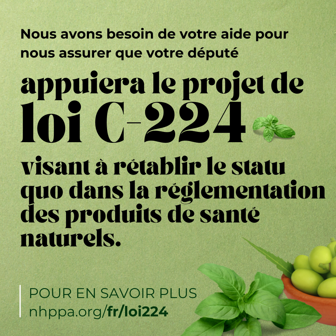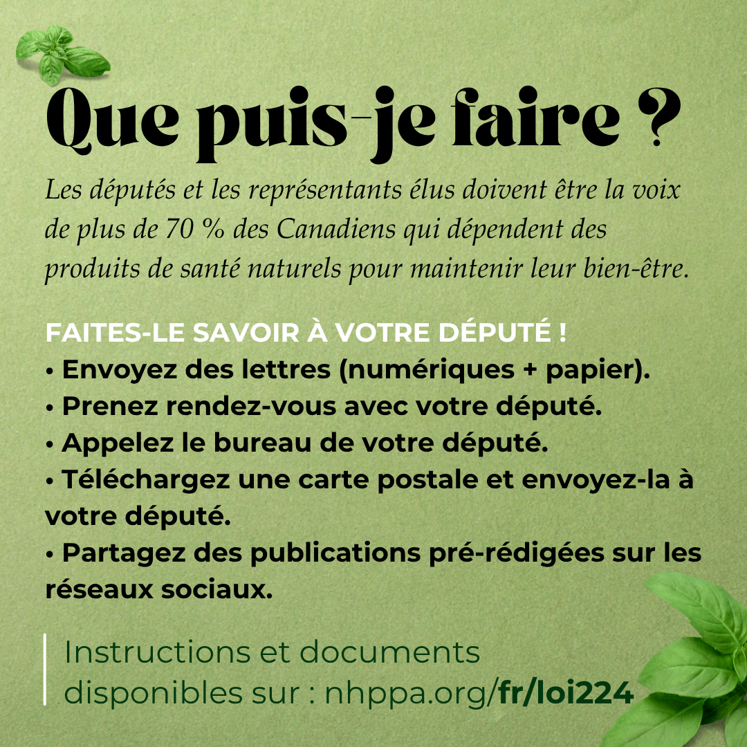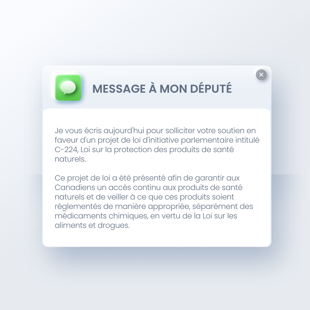 Dites à votre député ce que les produits de santé naturels signifient pour vous! Vous pouvez inclure une expérience positive que vous ou un membre de votre famille avez vécue en utilisant des produits de santé naturels. Les histoires personnelles sont certaines des communications les plus frappants que nous puissions partager avec nos représentants élus.