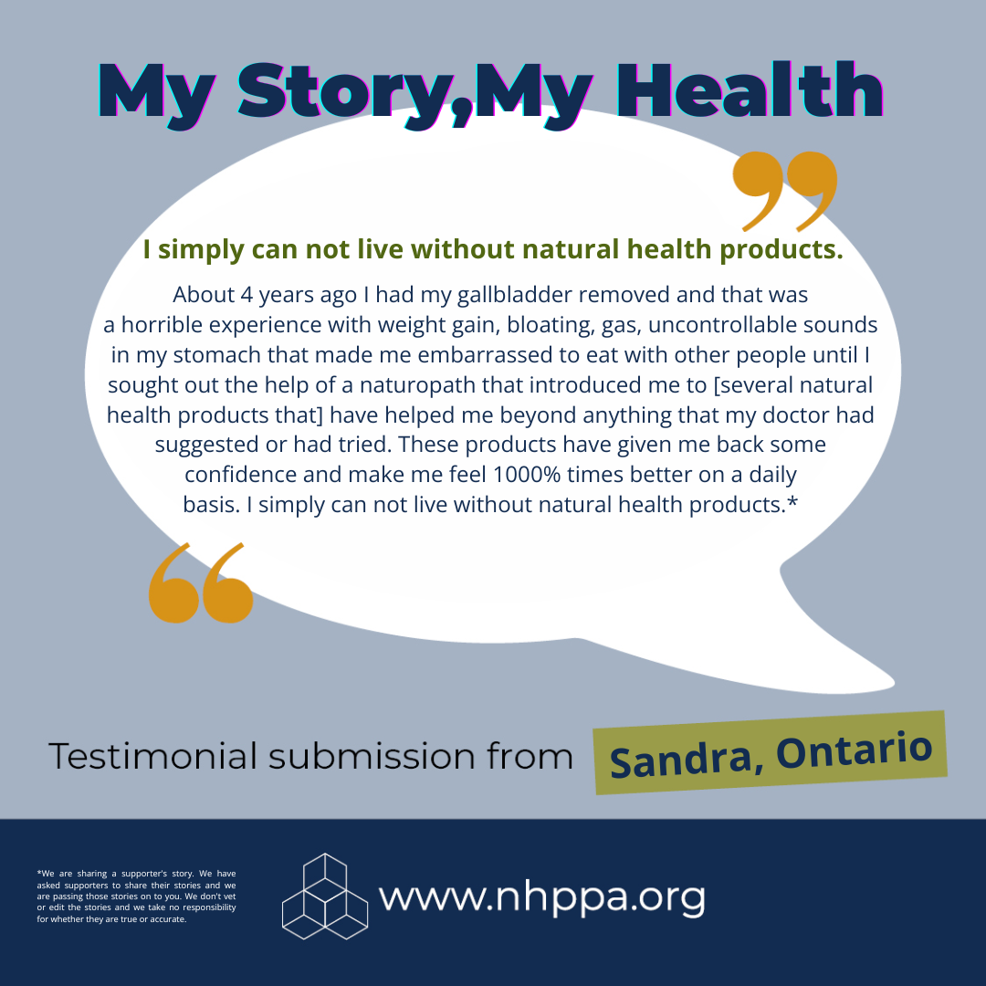 We will publish select testimonials on our website, social media channels, and through outreach campaigns. Future campaigning efforts to Health Canada and Elected Officials will be dedicated to communicating how natural health products have helped Canadians and the importance of maintaining access to these essential products.