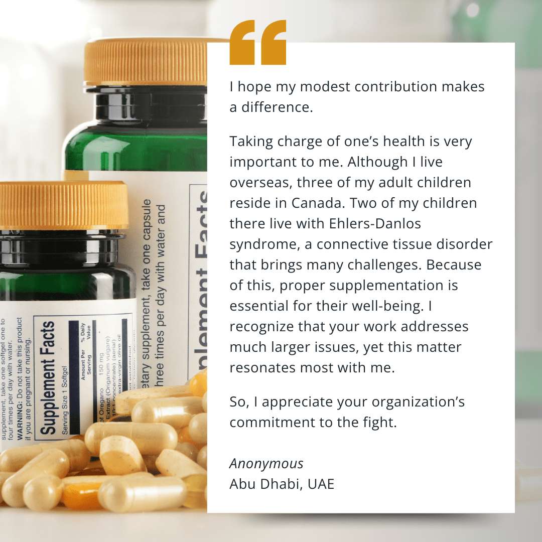 This donor’s two adult children are navigating life in Canada with Ehlers-Danlos syndrome (EDS), a connective tissue disorder that requires a supportive approach to care. (1) For this family, proper supplementation isn’t just a preference, it’s essential for their well-being. And yet, under Health Canada’s Self-Care Framework, access to critical natural health products is under threat. The result? Fewer choices for families who rely on them most.